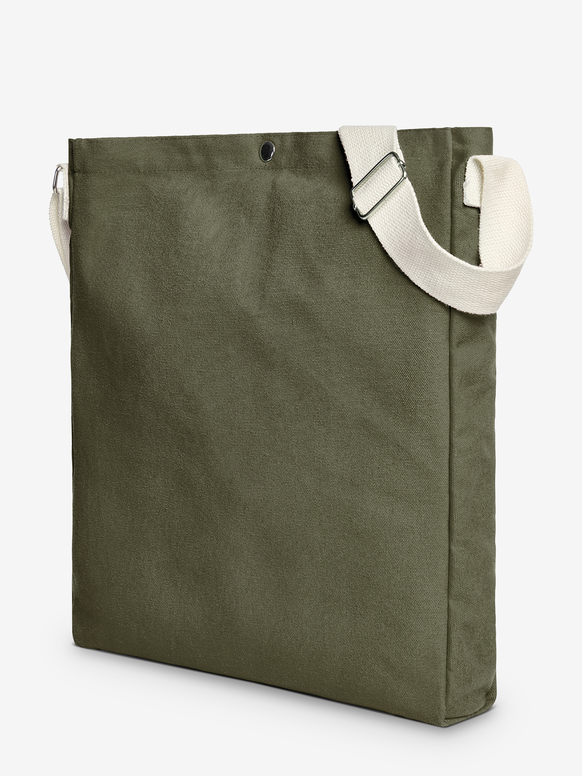 gradliniger Shopper mit großer Werbefläche; geräumiges Hauptfach - ideal geeignet für Kataloge und DIN A4-Unterlagen, mit Druckknopf verschließbar; breiter, längenverstellbarer Baumwoll-Schultergurt