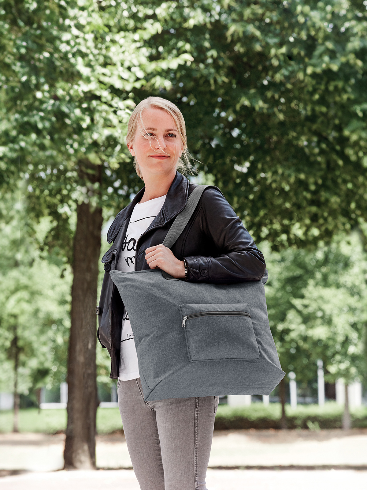 großer Shopper; geräumiges Hauptfach mit Reißverschluss; Reißverschluss-Vortasche; Reißverschluss-Innentasche; lange Tragegriffe; Falt- und Verstaufunktion