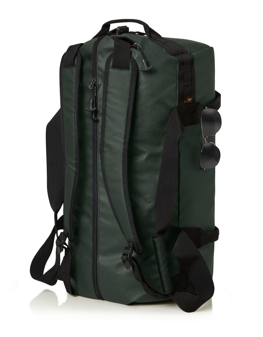 komfortable Sport-Reisetasche mit Rucksackfunktion; geräumiges Hauptfach mit 2-Wege-Reißverschluss und seitlichen Steckverschlüssen; seitliches Reißverschlussfach; Reißverschluss-Vortasche; umlaufendem Funktions- Schlaufenband; diverse Handgriffe; Tragegriffe und versteckte, gepolsterte und längenverstellbare Schultergurte