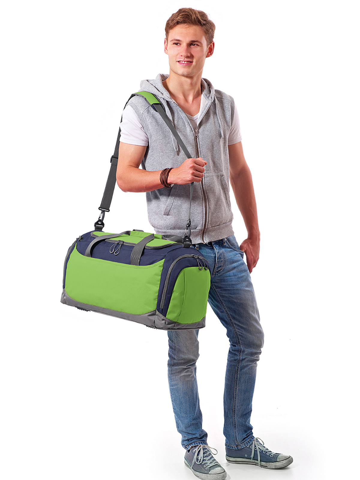 geräumiges Hauptfach mit 2-Wege Reißverschluss; Vortasche mit Reißverschlussfach; 2 Seitentaschen, eine davon mit Schuhfach; abnehmbarer, längenverstellbarer Umhängegurt mit bequemem Schulterpolster; Handgriffe mit Griffmanschetten; Bodenfüße