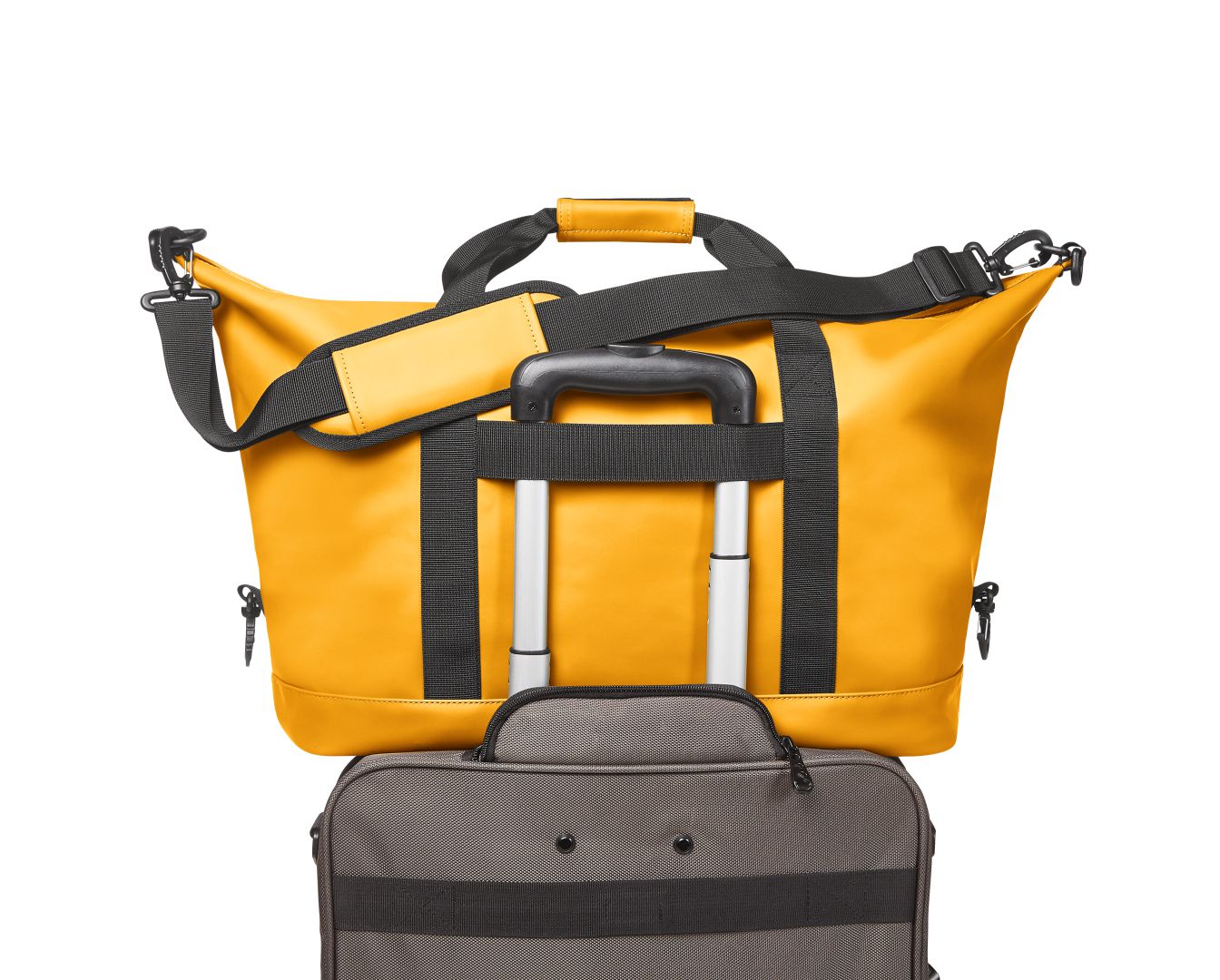 Wann hat Sie das letzte Mal die Sehnsucht gepackt, mit einer leichten Tasche los in die Welt zu ziehen? Falls Sie das Gefühl demnächst noch einmal kriegt, haben wir hier das passende Gepäckstück dazu: die Sport-/Reisetasche PURE. Sie sieht gut aus und kann richtig was. Das liegt zum einen am Recycelobermaterial mit Abperleffekt, das Regenschauern trotzt – genau wie die wasserdichten Reißverschlüsse. Zum anderen an den Trendfarben und dem schicken, minimalistischen Design. Alles andere als mini ist das Volumen, das für den Citytrip genauso passt wie für den Tag in Fitnessstudio und Sauna. Für das bisschen Mehr lassen sich die Karabiner lösen und geben noch extra Raum frei. Gut tragbar bleibt das Ganze dank der Handgriffe und des längenverstellbaren Schultergurtes – beide mit bequemen Polstern bzw. Manschetten ausgestattet. Und falls Sie es sich unterwegs gerne noch leichter machen möchten: mit der rückseitigen Lasche können Sie die PURE einfach auf einen Trolley aufschnallen. Gute Reise oder auch: gut Sport!