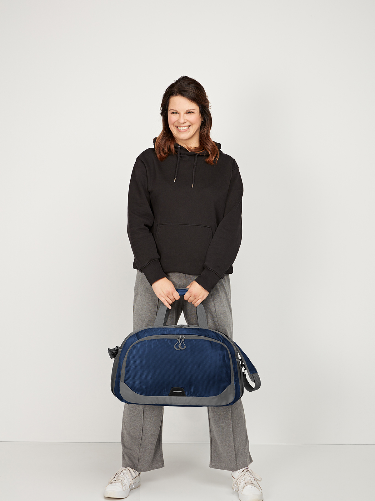 geräumiges Reißverschluss-Hauptfach mit Organizer-Funktion und festem Einlegeboden; Reißverschluss-Vortasche mit Reflektorelement; seitliche Netzfächer; rückseitiges Schuhfach; Handgriffe mit gepolsterter Griffmanschette; abnehmbarer, längenverstellbarer Schultergurt