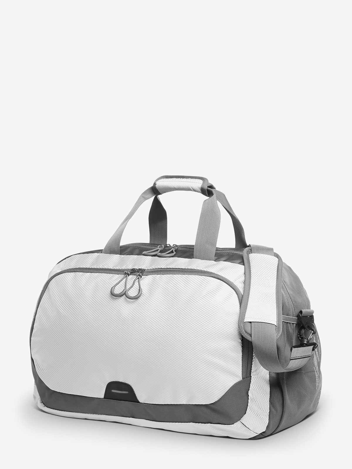 geräumiges Reißverschluss-Hauptfach mit Organizer-Funktion und festem Einlegeboden; Reißverschluss-Vortasche mit Reflektorelement; seitliche Netzfächer; rückseitiges Schuhfach; Handgriffe mit gepolsterter Griffmanschette; abnehmbarer, längenverstellbarer Schultergurt