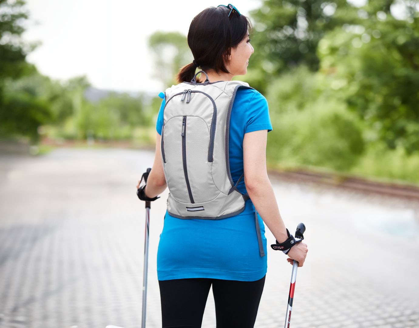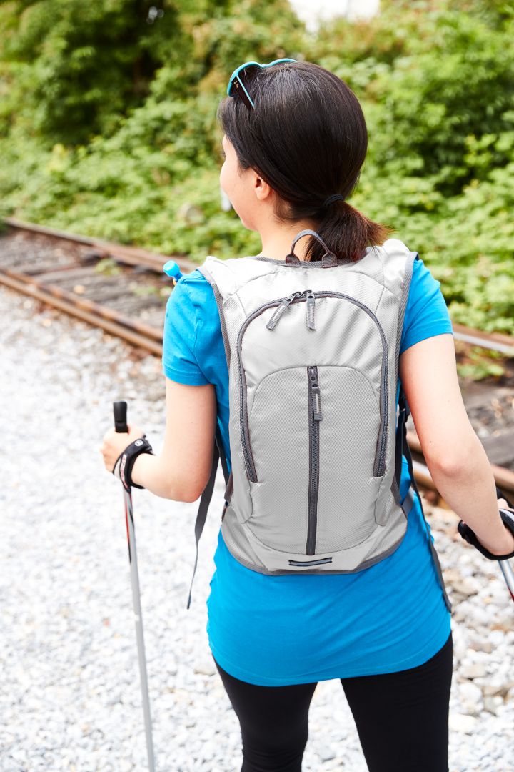 sportlicher, ergonomisch geschnittener Rucksack; gepolstertes Gurtsystem; verstellbarer Brust- und Hüftgurt; Reißverschluss-Vortasche; innen flaches Einsteckfach u.a. geeignet für zusätzlich lieferbares Trinksystem