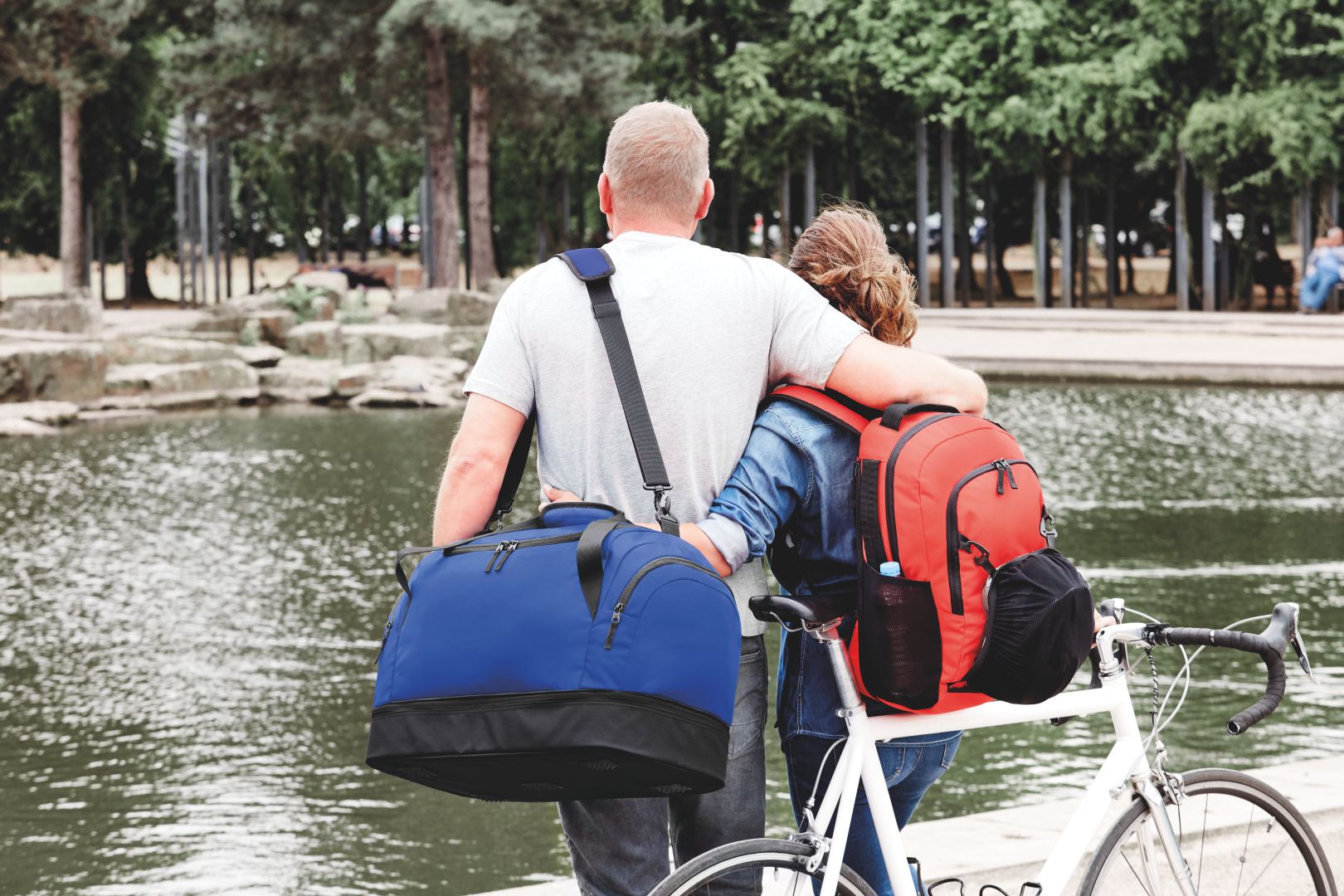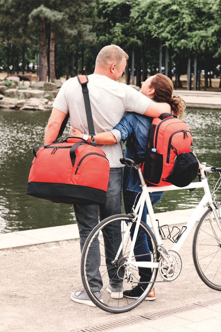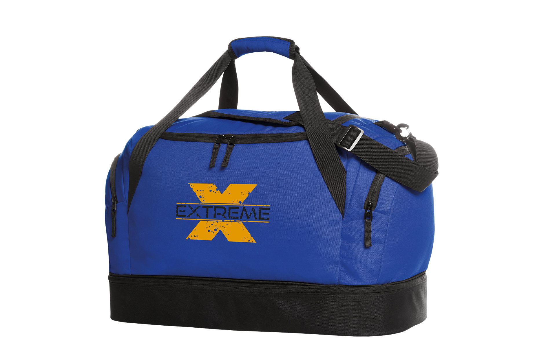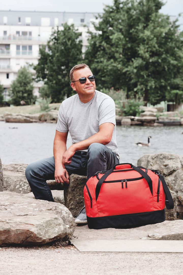 klassische Sport- und Freizeittasche mit stabiler, separat bestückbarer Bodenwanne; großes Hauptfach mit 2-Wege-Reißverschluss; fester Boden mit Bodenfüßen; Reißverschluss-Innenfach; zwei Reißverschluss-Seitentaschen; Tragegriffe mit Griffmanschette; abnehmbarer, längenverstellbarer Schultergurt mit Schulterpolster