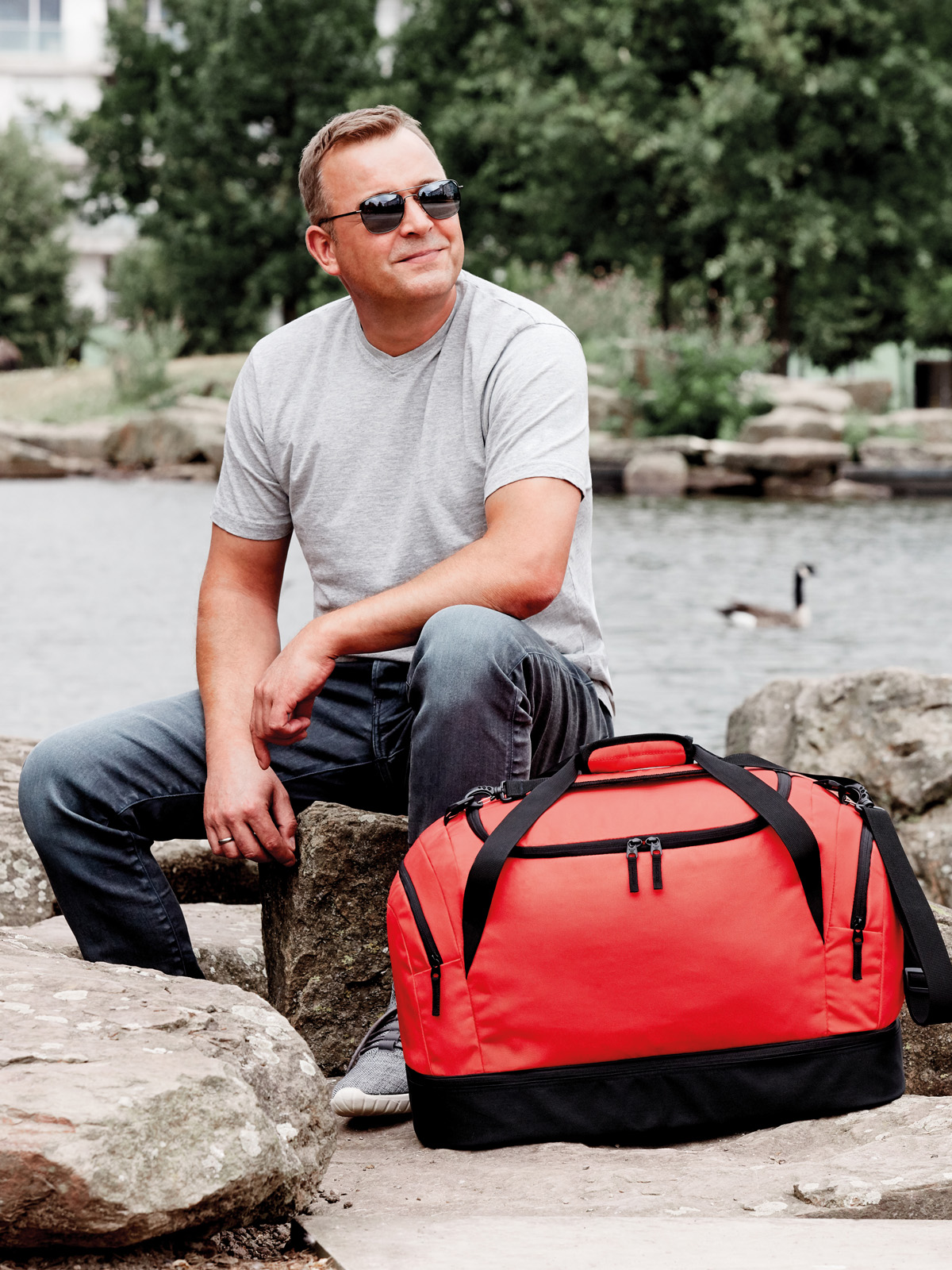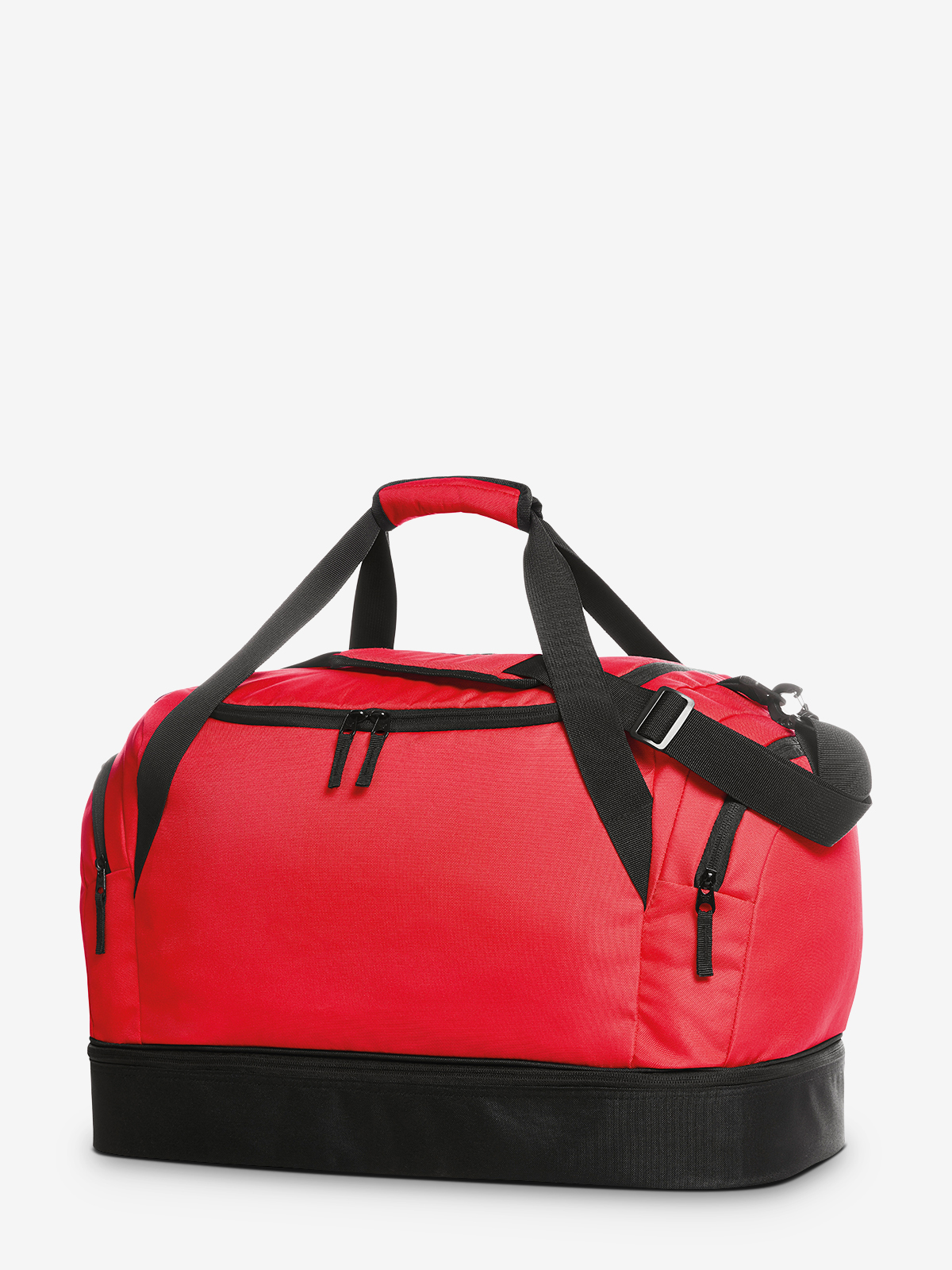 klassische Sport- und Freizeittasche mit stabiler, separat bestückbarer Bodenwanne; großes Hauptfach mit 2-Wege-Reißverschluss; fester Boden mit Bodenfüßen; Reißverschluss-Innenfach; zwei Reißverschluss-Seitentaschen; Tragegriffe mit Griffmanschette; abnehmbarer, längenverstellbarer Schultergurt mit Schulterpolster