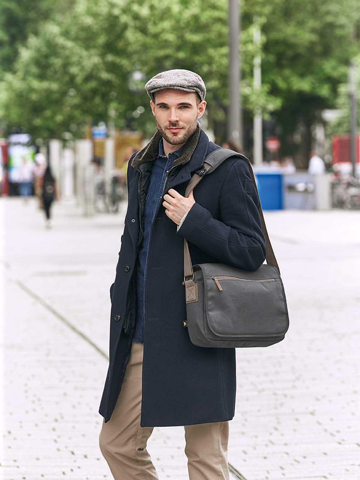 großes, rückseitig gepolstertes Reißverschluss-Hauptfach mit gepolstertem Einsteckfach z.B. für Tablets; flaches Reißverschluss-Innenfach; flache Vortasche auf der Front; Überschlag mit Magnetverschluss und Reißverschluss-Vortasche; längenverstellbarer Schultergurt mit genähtem Schulterpolster; wertige Metallaccessoires und PU-Velours-Kunstleder-Applikationen