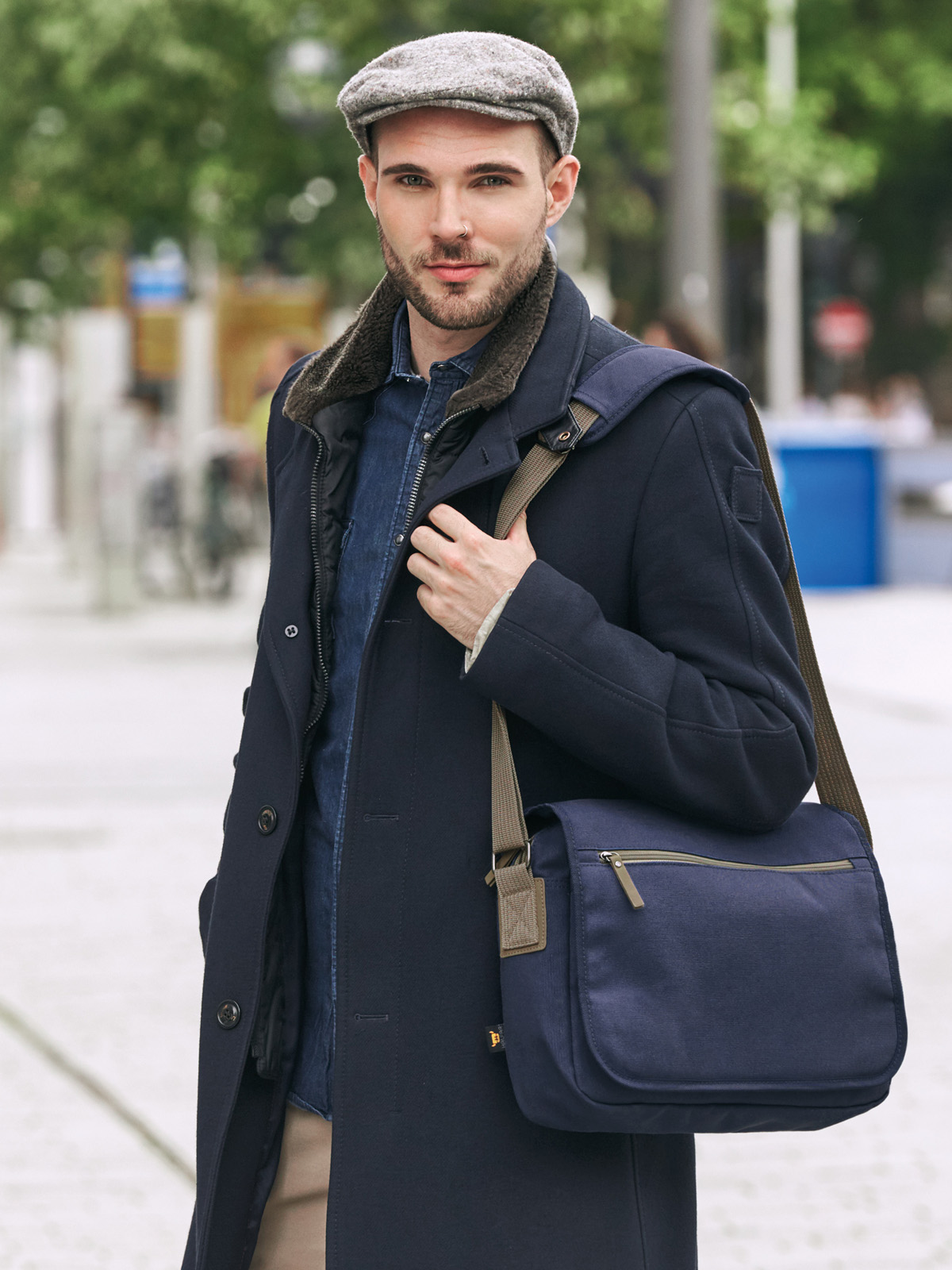 großes, rückseitig gepolstertes Reißverschluss-Hauptfach mit gepolstertem Einsteckfach z.B. für Tablets; flaches Reißverschluss-Innenfach; flache Vortasche auf der Front; Überschlag mit Magnetverschluss und Reißverschluss-Vortasche; längenverstellbarer Schultergurt mit genähtem Schulterpolster; wertige Metallaccessoires und PU-Velours-Kunstleder-Applikationen