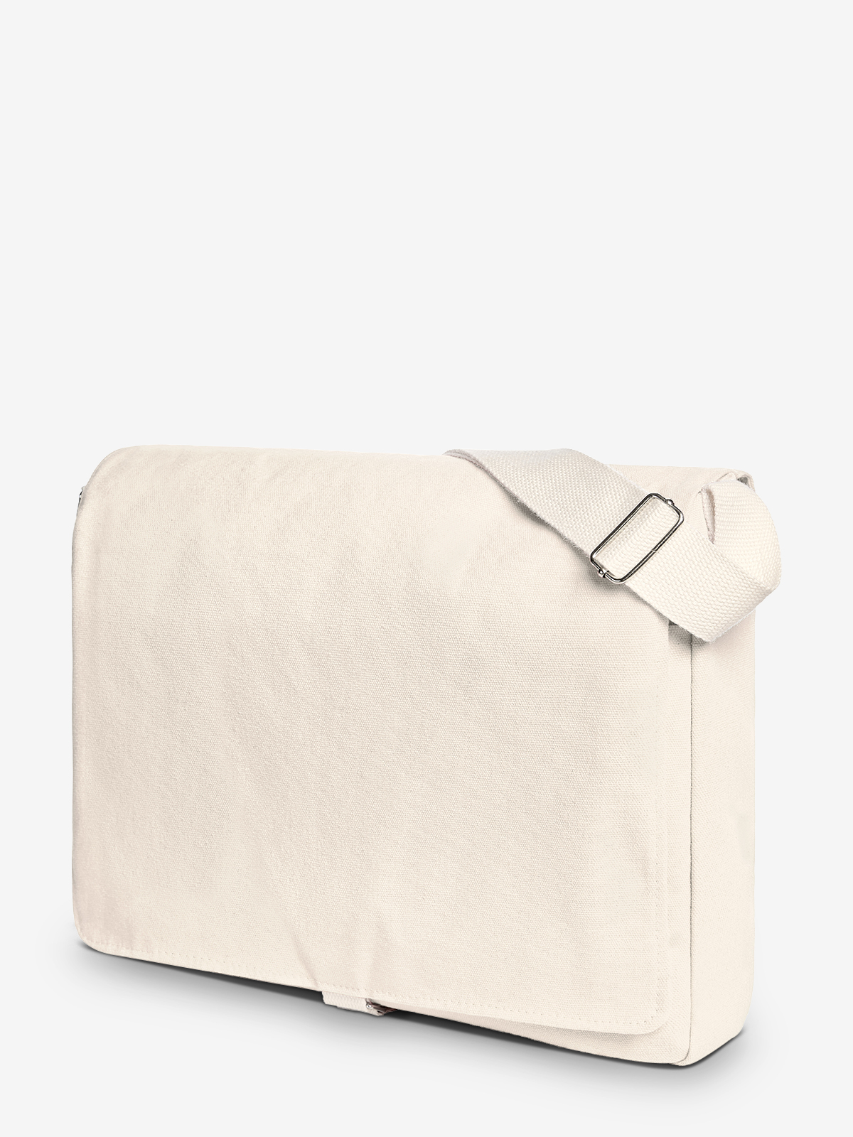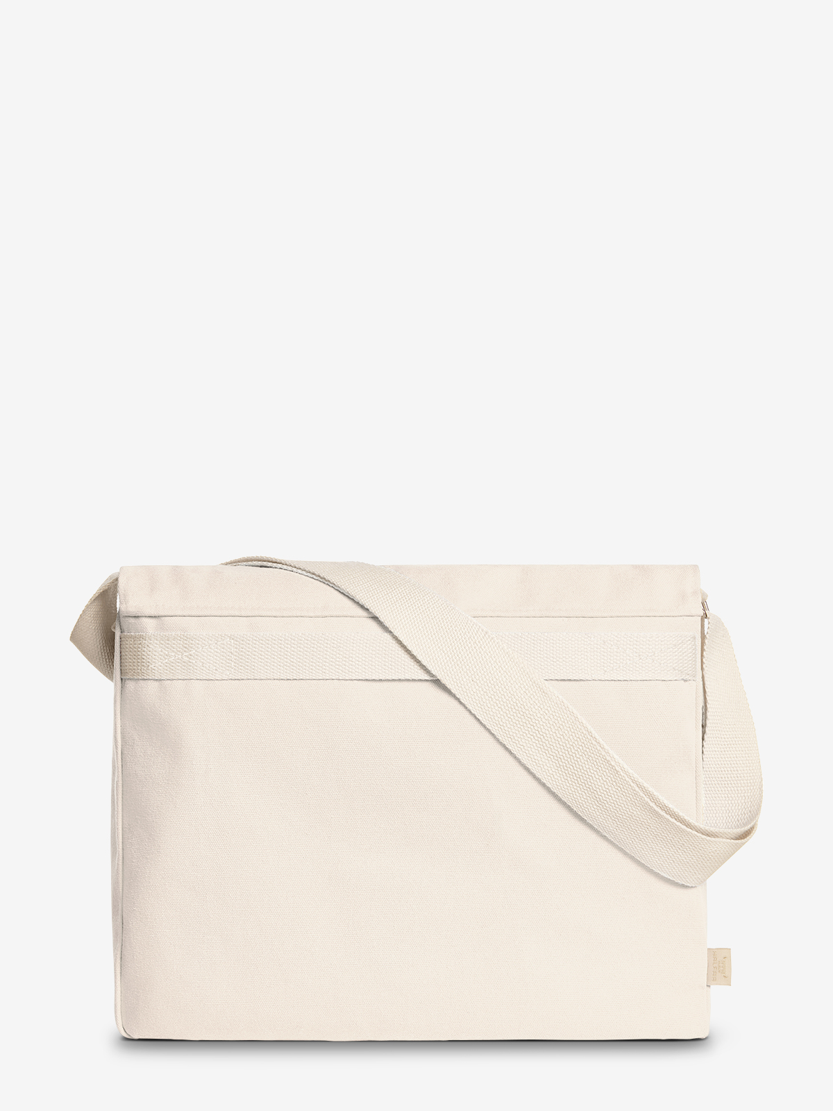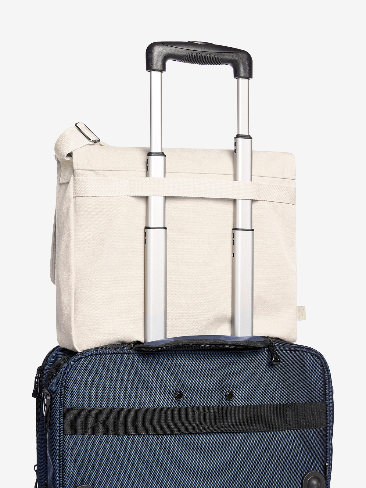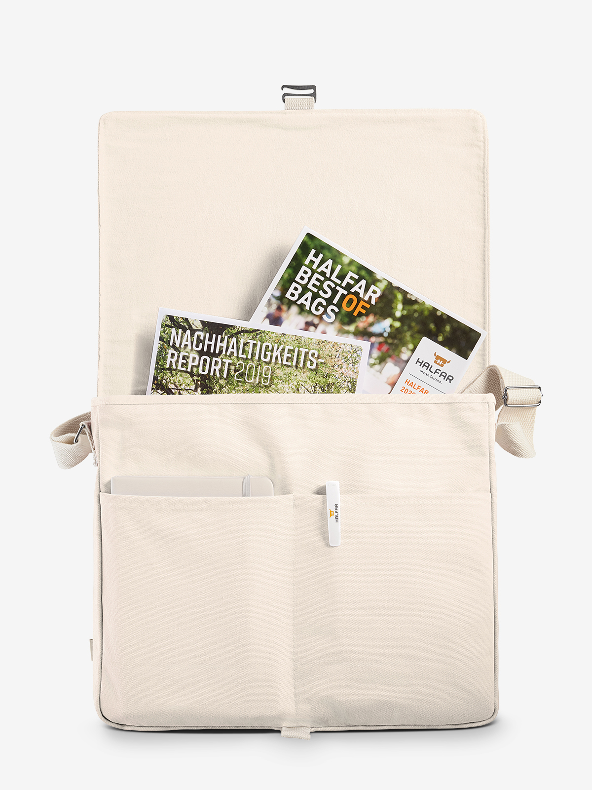Überschlagtasche mit wertigen Metall-Accessoires; Bügelverschluss; großes Hauptfach u.a. geeignet für A4 Unterlagen; zwei flache Einsteckfächer auf der Front; rückseitige Befestigungsschlaufe für Trolley-Gestänge - alternativ auch als Handgriff nutzbar; breiter, längenverstellbarer Baumwoll-Schultergurt