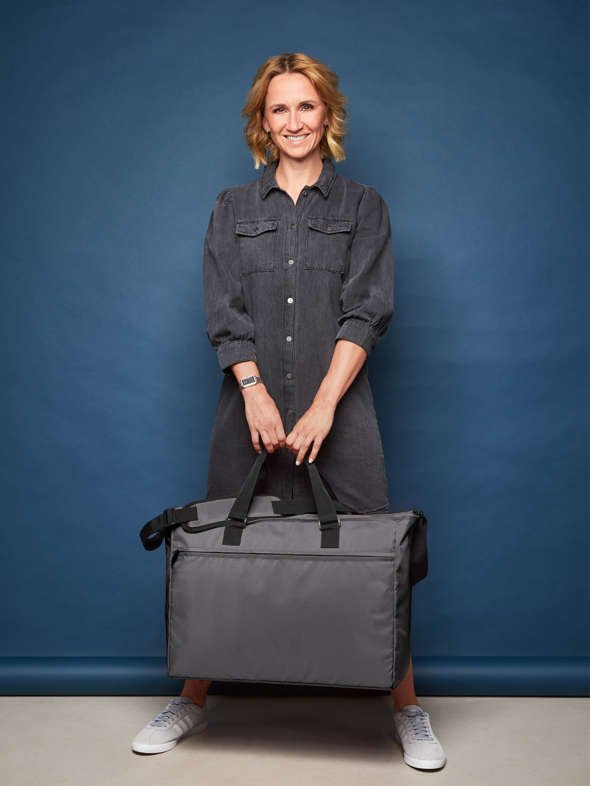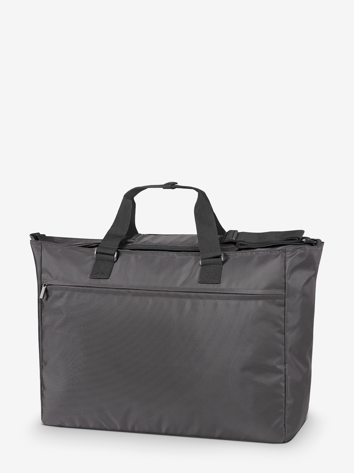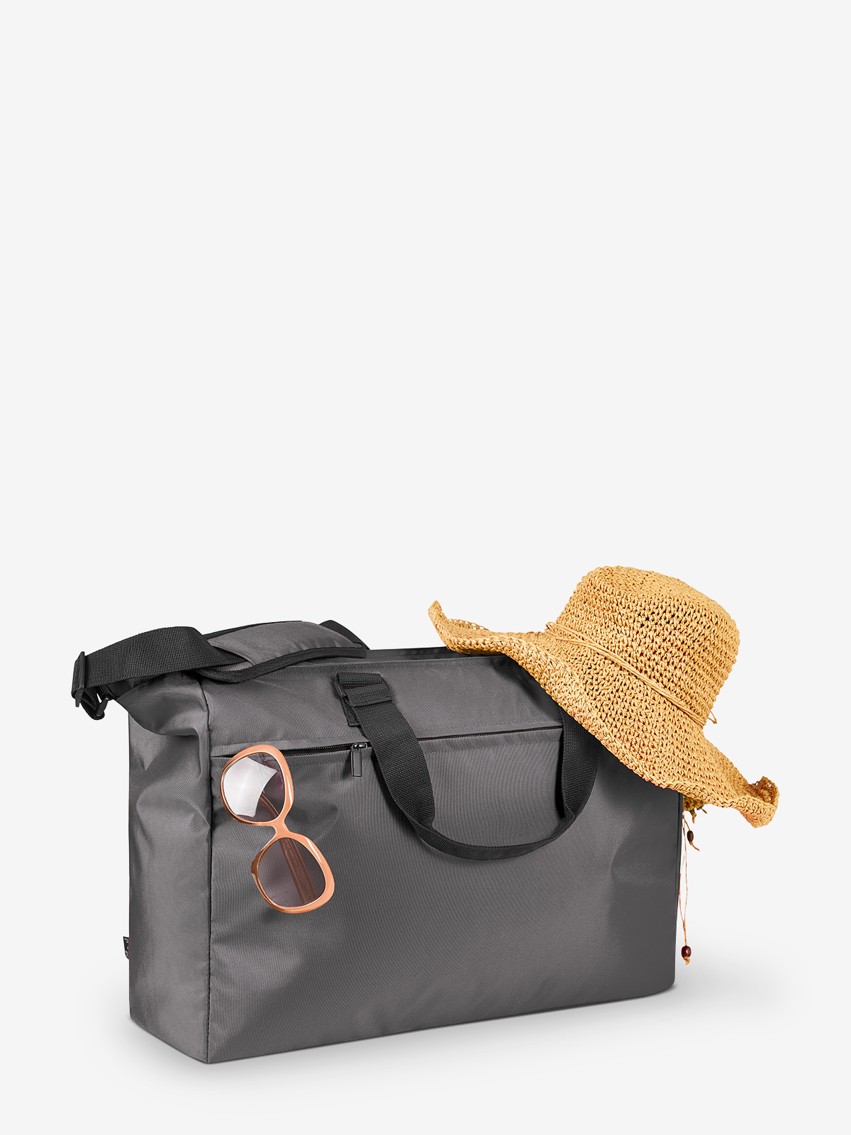 moderner, leicht gepolsterter Weekender; rPET-Obermaterial; großes Hauptfach mit 2-Wege-Reißverschluss; Reißverschluss-Vortasche; flaches Reißverschlussfach innen; beidseitig längenverstellbarer Tragegurt mit genähtem Schulterpolster; Handgriffe mit Druckknopfmanschette