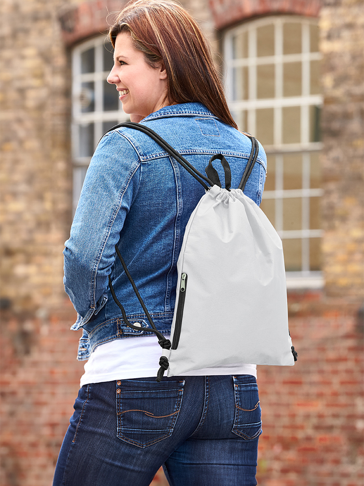 großer Zugbeutel-Rucksack; Hauptfach mit seitlicher Reißverschluss-Tasche; Kordelzug; Trageschlaufe