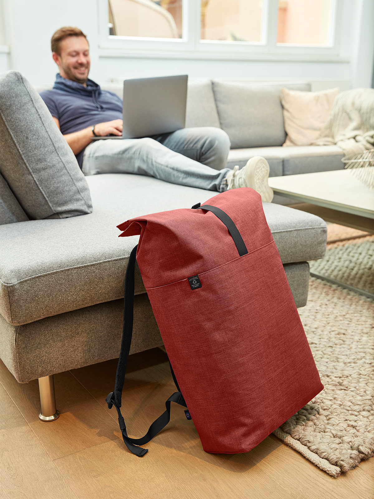 urbaner Rucksack mit Magnet- und Wickelverschluss; geräumiges Hauptfach mit gepolstertem Notebookfach; rPET Obermaterial; rückseitige Reißverschlusstasche; aufwändig gepolsterter Rücken mit verstecktem Reißverschlussfach; gepolsterter Boden; längenverstellbare gepolsterte Schultergurte mit Gummischlaufen zum Befestigen von z.B. Sonnenbrille; Handgriff