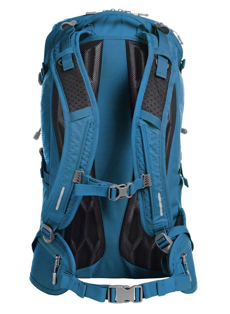 leichter, funktioneller Rucksack mit ergonomisch geformtem Rücken und innovativem Wabensystem für ideale Belüftung und Polsterung, oben wie unten höhenverstellbar für eine perfekte Passform; höhenverstellbarer Brustgurt; gepolsterter Beckengurt mit Reißverschlusstaschen; großes 2-Wege-Reißverschluss-Hauptfach mit flachem Einsteckfach innen; rückseitiger Ausgang geeignet für z.B. Kopfhörer oder Schlauch des zusätzlich lieferbarem Trinksystems (Artikel 1812216); Klettloop zur Fixierung des Trinkschlauches; 2 Reißverschlussvortaschen; 2 Netz-Seitentaschen; seitliche Zurrgurte; funktionales Schlaufenband auf der Fronttasche; dekorativer Reflex-Aufdruck; Wanderstockfixierungen; Bodenfach mit Regenhülle; Handgriff